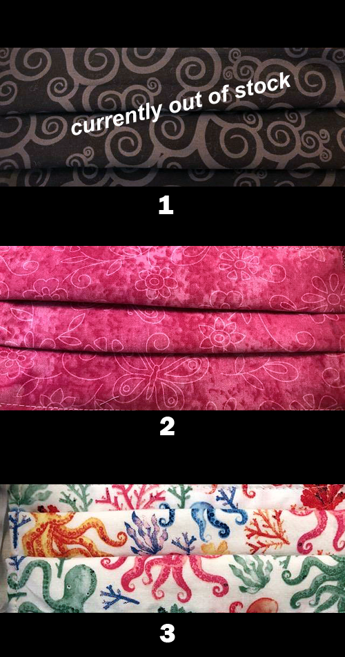 5 piece lots will come all white, all black or assorted using 5 of the fabrics shown in our pictures.